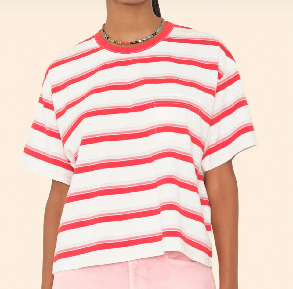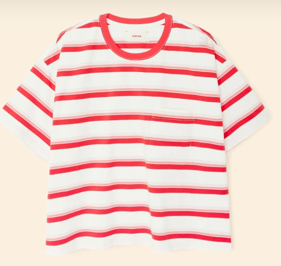 Back to Basics. Paulina is new this season in our ultra-soft striped cotton jersey. Paulina is an updated version of our bestselling Palmer Tee with a left chest pocket and contrast ringer neck.