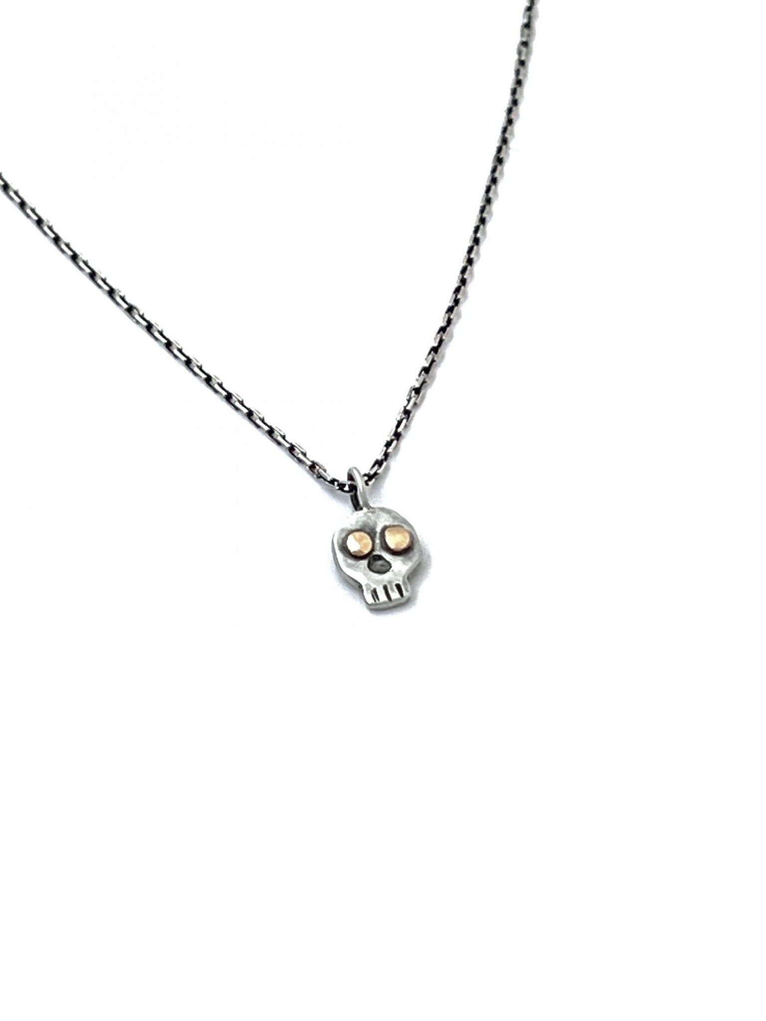 The skull is often said to symbolize strength, wisdom, courage, and protection. This sterling silver skull necklace showcases a striking contrast of dark, oxidized silver with shiny 14k gold rivets. Each skull is hand- fabricated by our lead metalsmith. Two 14k gold eyes are individually soldered on and hand- hammered for a riveted finish. The skulls are then carefully sanded, buffed, oxidized, and polished in our silversmithing studio. Skull charm hangs from an 18" rustic oxidized sterling silver chain necklace. The 18" length lends itself well to layering-- try pairing it with a shorter, 16" gold chain necklace and a longer strand of beads for the perfect CLP necklace stack.