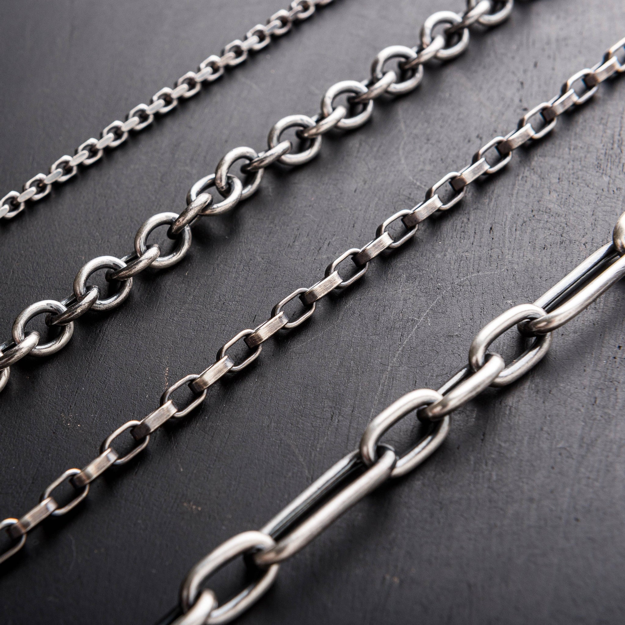 Chunky sterling silver flat edge cable chain, patinaed and finished by hand to bring out its personality.