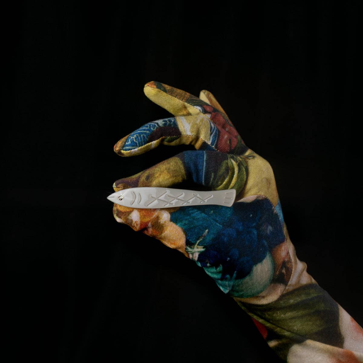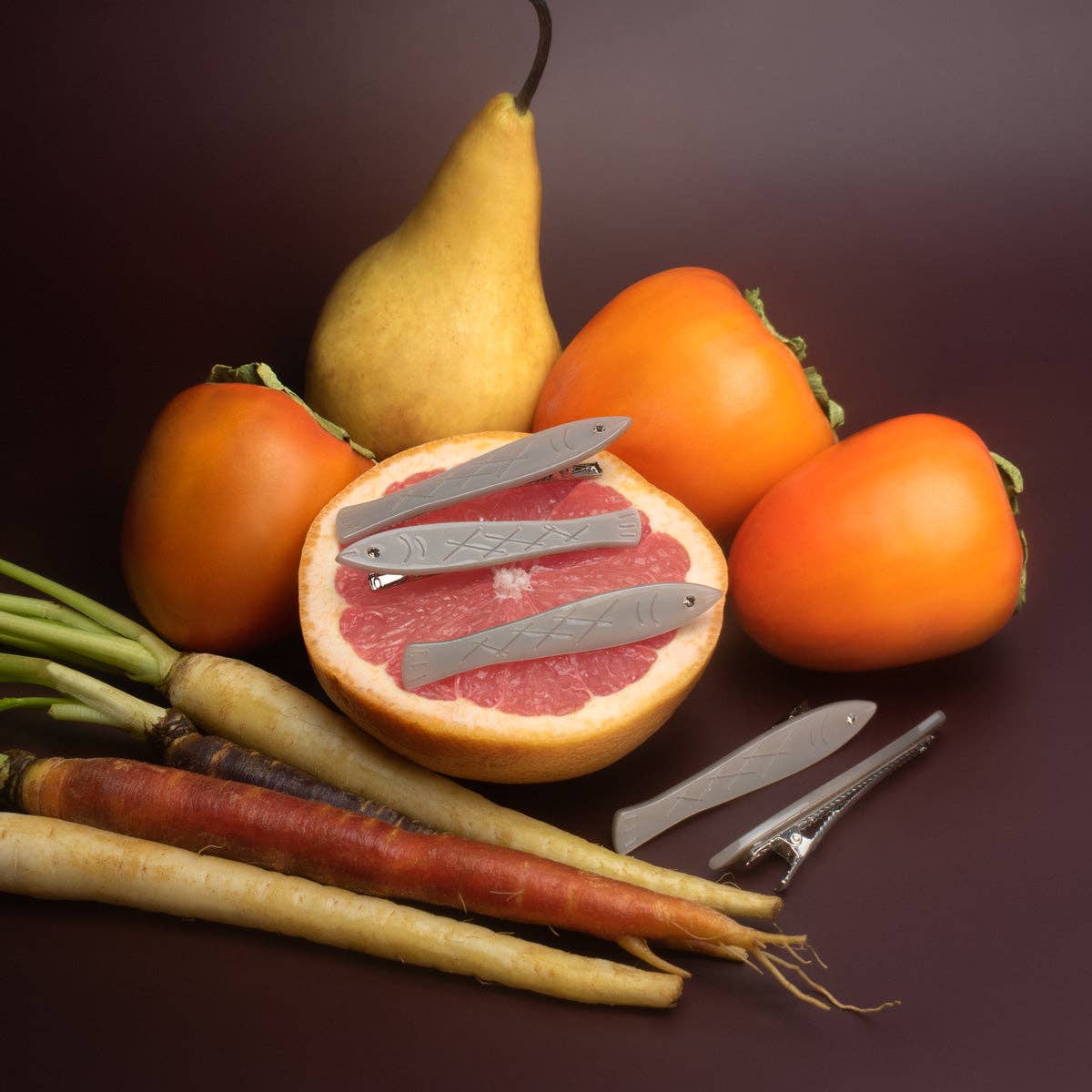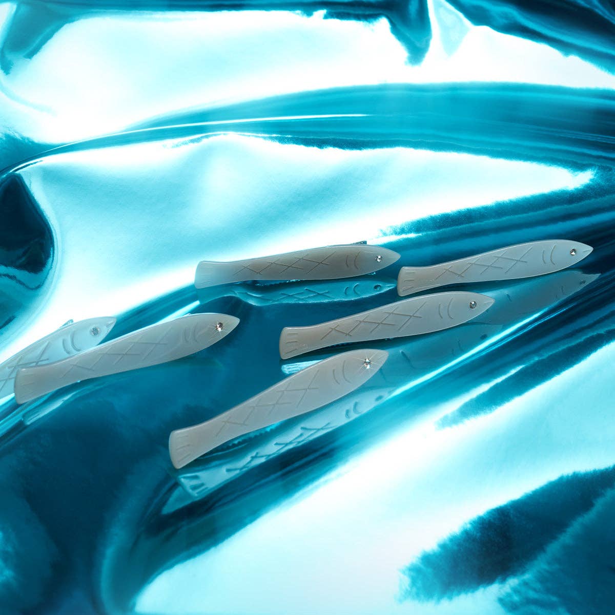 A pair of silvery sardines, with delicate details and the perfect amount of sparkle! *3 inches *Sold as a set of two clips. *Silver alligator clip-style backing.