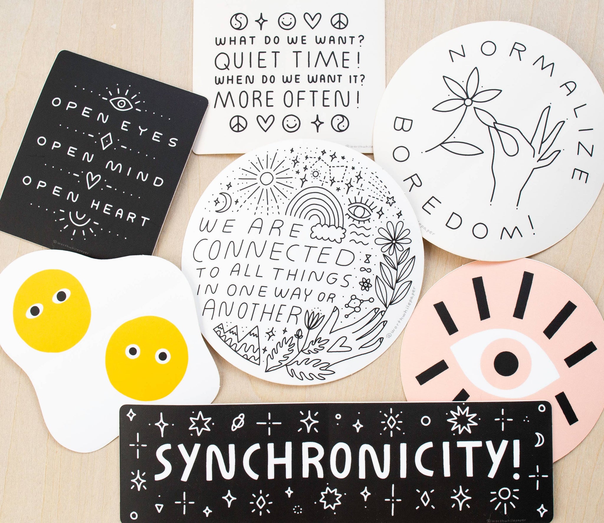 Adorn the world with inspiring stickers! This sticker encourages us to slow down, do less, be calm, be bored even! Pick flowers, gaze at the sky, relax..
